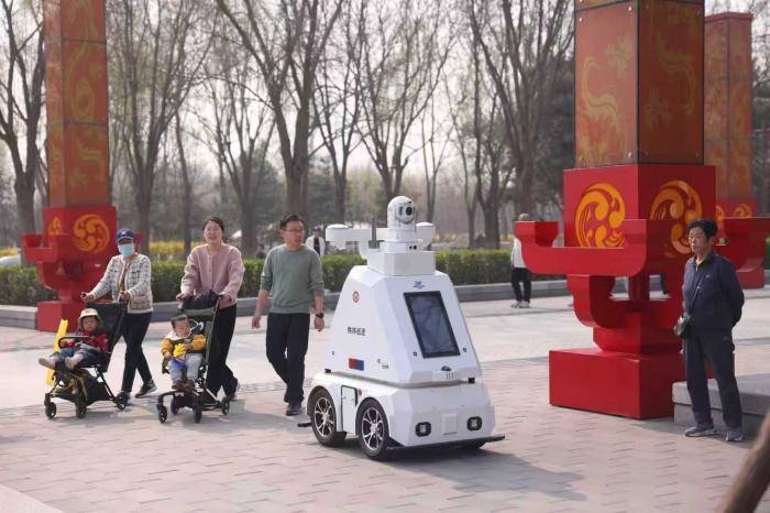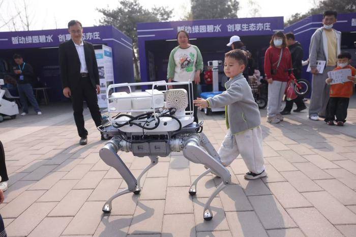 机器狗进行巡逻检查和定点值守。活动现场,各类机器人在公园场景进行应用和展示。